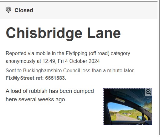 This awful flytip in Chisbridge Lane was first reported in October last year. I have asked for it to be cleared several times through the council channels. I brought it to full council’s attenion on 12th March and perhaps by embarrassing the Cabinet Member responsible it was cleared within two days. https://buckinghamshire.public-i.tv/core/portal/webcast_interactive/965270/start_time/8740000?force_language_code=en_GB